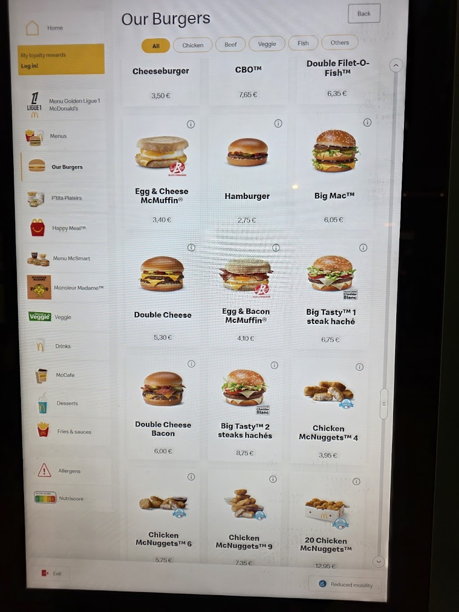 As an American in Paris, this McDonald's was very nice! Service was quick, I was able to use the kiosk in English, and the food tasted exactly like home. There are WAY more options here that we don't have at home, I enjoyed looking at the entire menu at things I've never seen before. The restaurant is 2 floors with an elevator or stairs to the 2nd which is extra seating. Plenty of kiosks to order from, and the employees were friendlier than at home. Yall don't realize how good you have it, excellent McDonald's 5/5!
