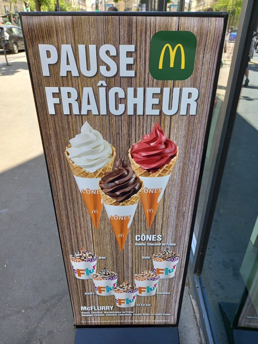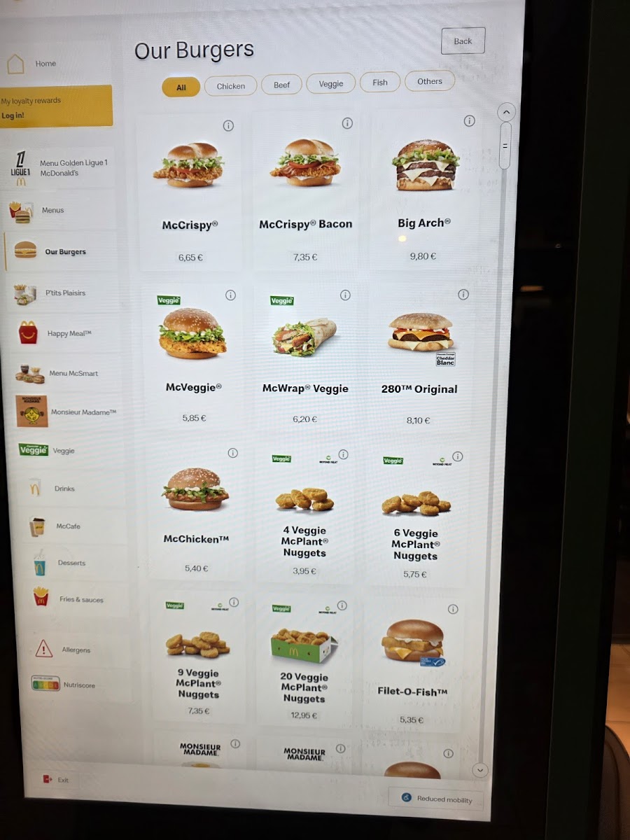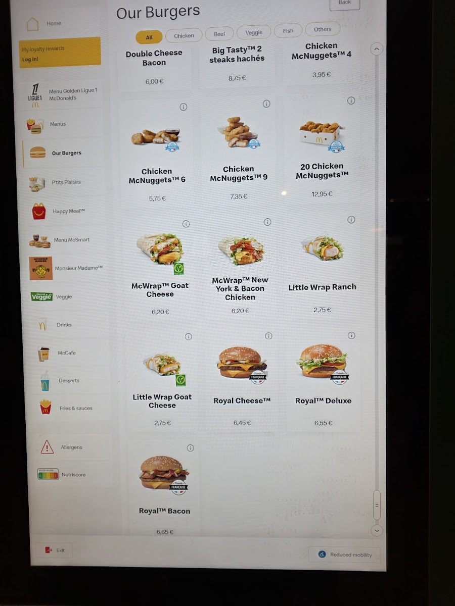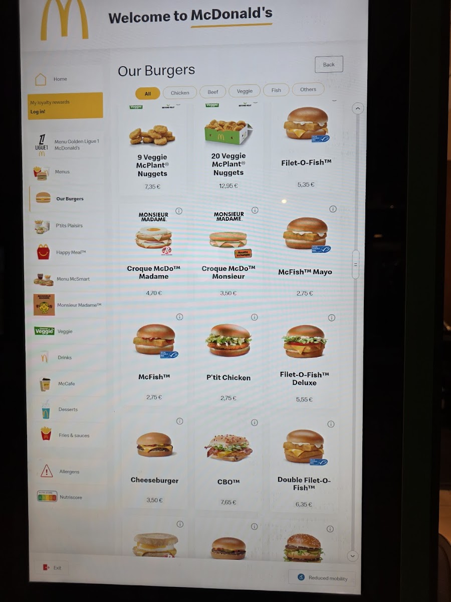 Staff was friendly and helpful to these Americans. I couldn't tell what drink I was getting on the self service kiosk, bc I could not read the French, so it was a mystery drink! First were good. In America we call these potatoes wedges.